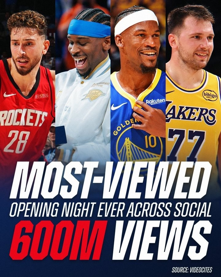 According to statistics, the two opening games of Thunder vs. Rockets and Lakers vs. Warriors achieved the highest traffic in history, with views exceeding 600 million times on all NBA and third-party social platforms (still growing).