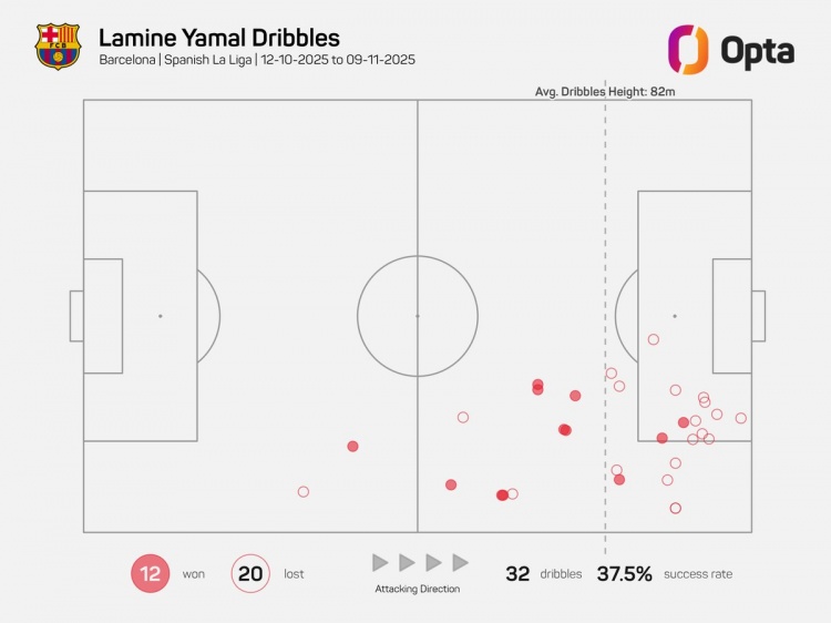 Opta pointed out that since October 12, the Yamal League has attempted 32 dribbles, tied with Toulouse player Boho for the most in the five major leagues, with a success rate of 37.5%.