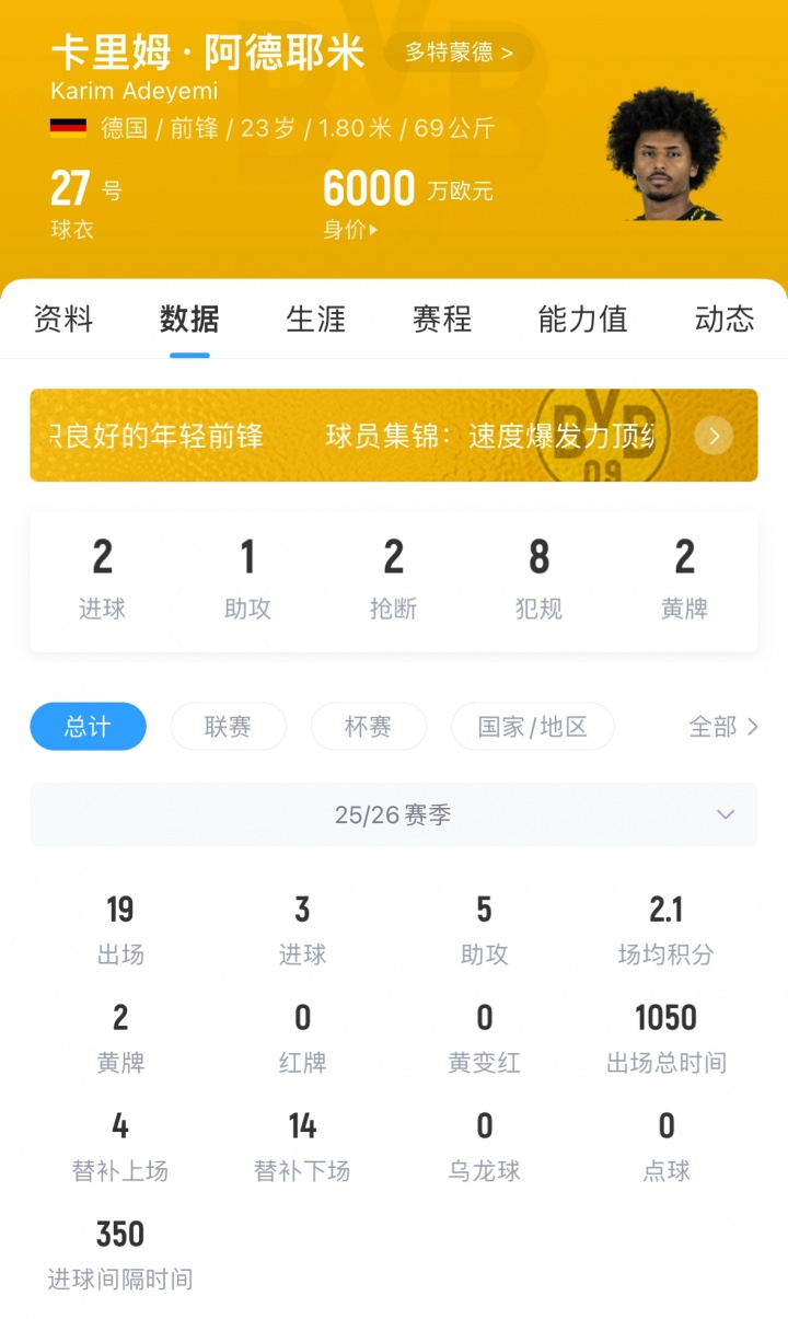 Adeyemi is 23 years old. He has played 19 times for Dortmund this season, contributing 3 goals and 5 assists. His contract with Dortmund will expire in 2027, and he is currently worth 60 million euros.