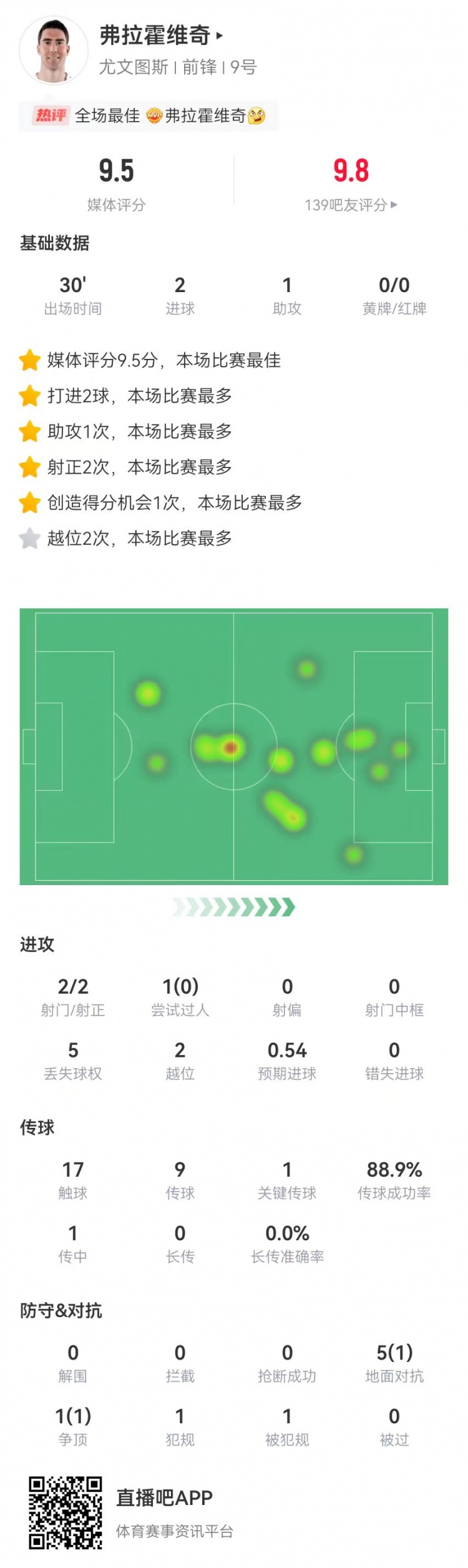Juventus drew 4-4 with Dortmund in this round of Champions League. Vlahovic's data is as follows: