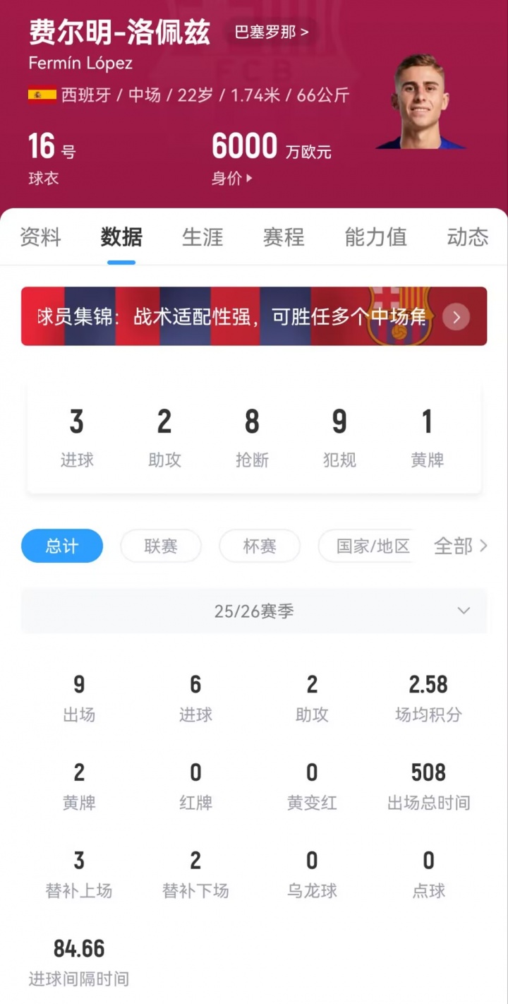In the latest value of German-to-La Liga players updated a month ago, Fermin's value increased by 10 million to 60 million euros, setting a new career high.