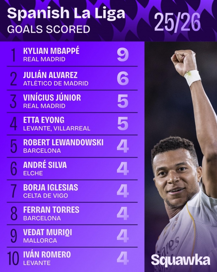 A few days ago, Squawka counted the La Liga scorer list this season, with Mbappe ranked first with 9 goals.