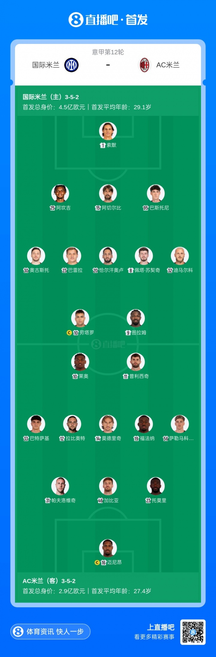 Inter Milan's starting lineup: 1-Sommer, 15-Acerbi, 95-Bastoni, 25-Akanji, 30-Carlos Augusto, 23-Barreira, 20-Calhanoglu, 8-Sucic, 32-Dimarco, 9-Thuram, 10-Lautaro
