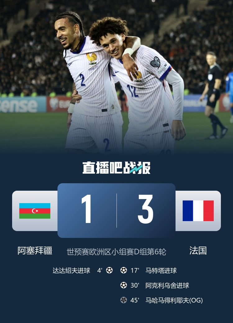 In the sixth round of Group D of the European Group Stage in the World Cup preliminaries, France reversed Azerbaijan 3-1. Gusteau provided two assists and Mateta scored.