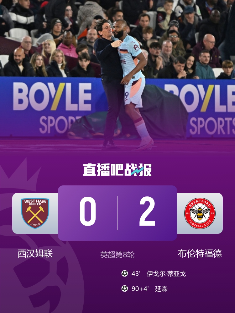 In the 8th round of the Premier League, West Ham United 0-2 Brentford and suffered a 4th consecutive home defeat.