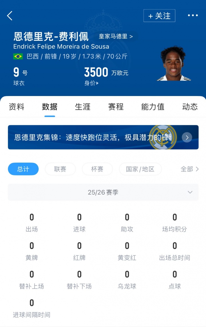 Endrick’s last official game was the away game against Sevilla in the 37th round of La Liga last season in mid-May. Since then, he has suffered consecutive hamstring and thigh injuries, missed the Club World Cup and Real Madrid's early season preparations, and missed a total of 17 official games for Real Madrid.