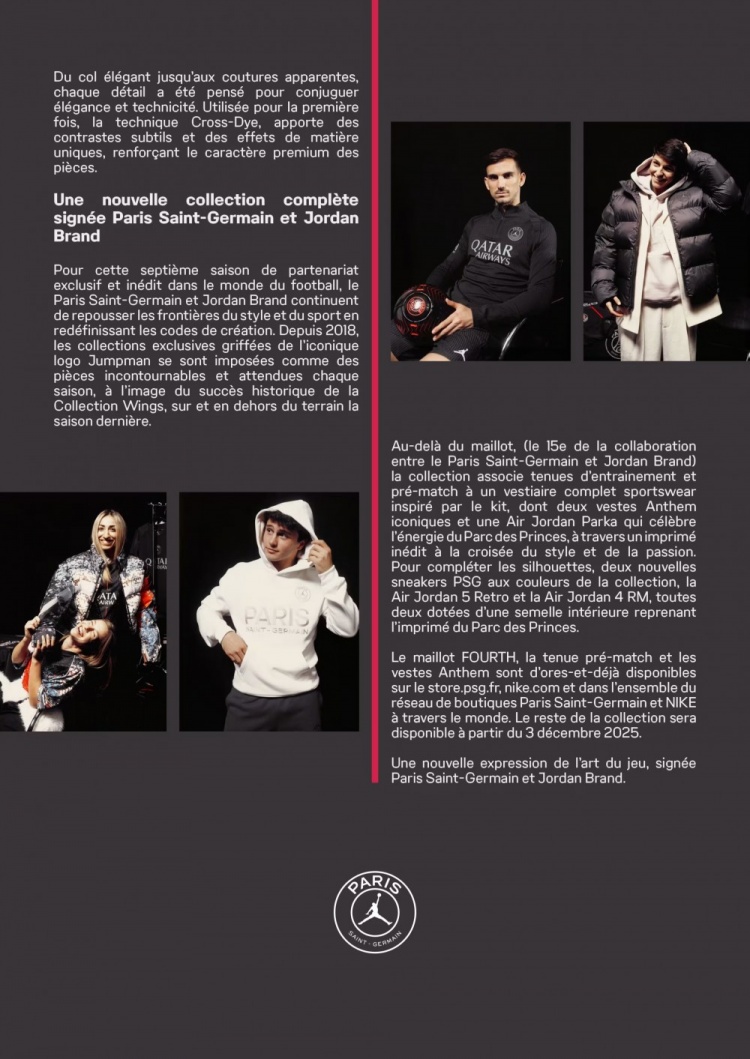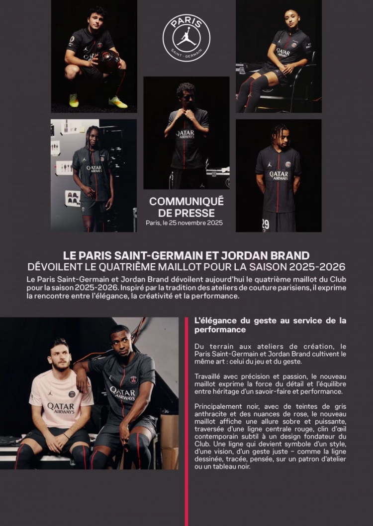 Official news, Paris and Jordan Brand announced today the club’s fourth jersey for the 2025-26 season. Its design is inspired by the tradition of Parisian fashion workshops, interpreting the fusion of elegance, creativity and performance.