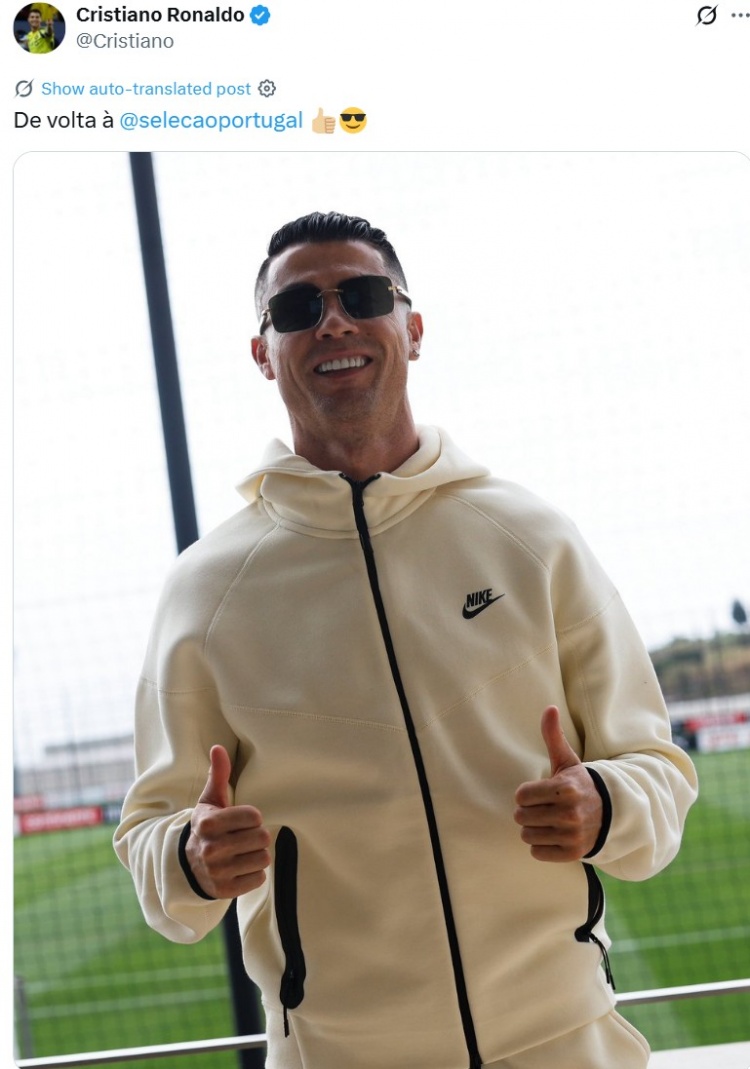 Ronaldo posted a photo of himself coming to the Portuguese national team training ground on his personal social media. He looked handsome wearing sunglasses, with the caption: "Return to the Portuguese national team again."
